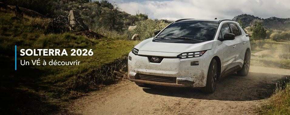 Voici la nouvelle Subaru Solterra 2026 – l’avenir de la conduite électrique en toute confiance. Repensée pour la vie au Canada, la Solterra offre une autonomie accrue, une recharge plus rapide et un contrôle raffiné avec les capacités authentiques de Subaru. Construite sur une plateforme de VÉ renforcée, ce VUS tout électrique et dynamique offre désormais jusqu’à 446 km d’autonomie1 et se recharge de 10 à 80 % en environ 30 minutes2 sur une borne rapide de niveau 3 en CC. Le groupe motopropulseur Subaru StarDrive® à deux moteurs développe 338 ch pour une accélération en douceur et en toute confiance en toute saison. À l’intérieur, l’habitacle lumineux et silencieux est doté d’un écran tactile de 14 pouces, de deux chargeurs de téléphone sans fil et de SubaruConnectMC pour une utilisation quotidienne en toute simplicité. Grâce à la traction intégrale symétrique à prise constante, à la fonction X-MODE® bimode et à une garde au sol de 210 mm, la Solterra transforme les caprices du climat canadien en une simple formalité. Servodirection électrique. Polyvalence bien concrète. Indéniablement signé Subaru.
